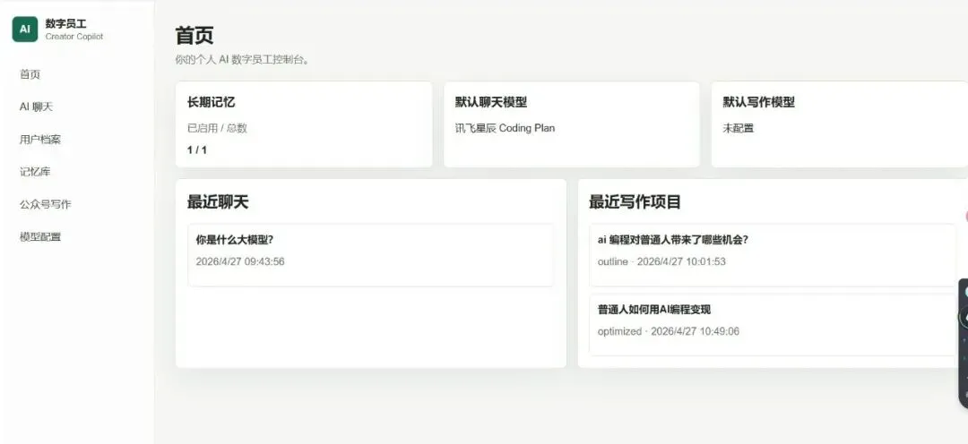 它的目标很简单:能聊天,有记忆,知道我是谁,能帮我写公众号文章,还能调用不同的大模型。