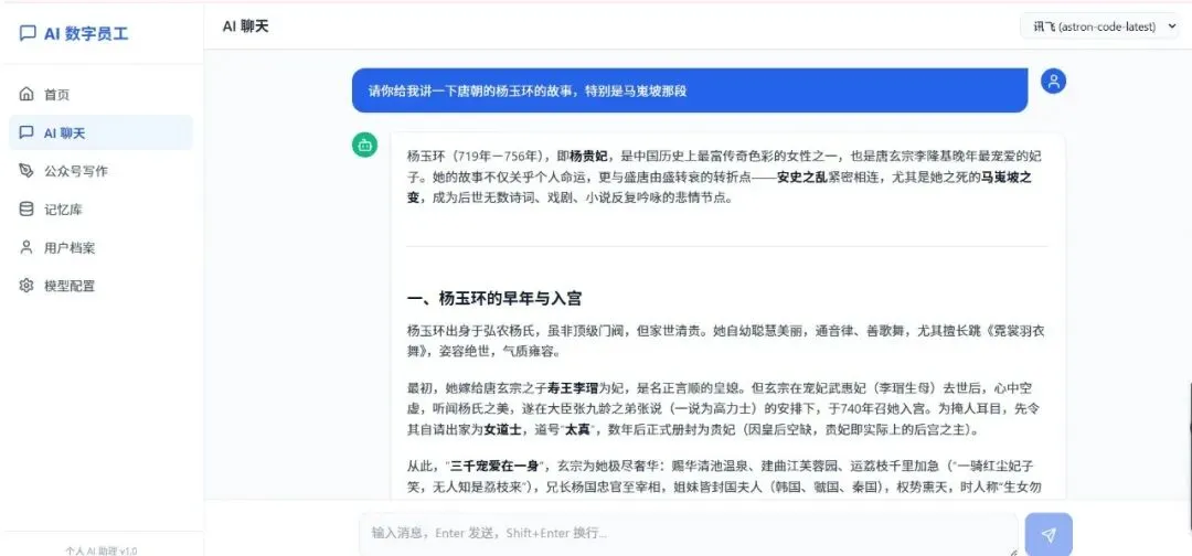 这点我很喜欢。因为我做的不是普通聊天框,而是数字员工。数字员工不能只是界面好看,后面一定要有数据、有记忆、有模型调用、有持续迭代的基础。