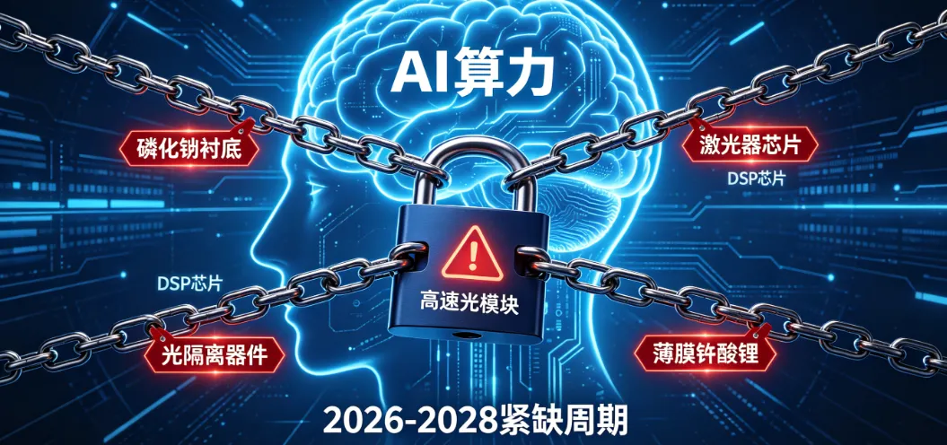 AI算力爆发带动高速光模块需求井喷,上游核心物料供需持续失衡,五大紧缺材料成为产业链关键瓶颈,紧缺周期贯穿2026-2028年。提醒CPO板块股价高企,逢低布局,谨慎投资。