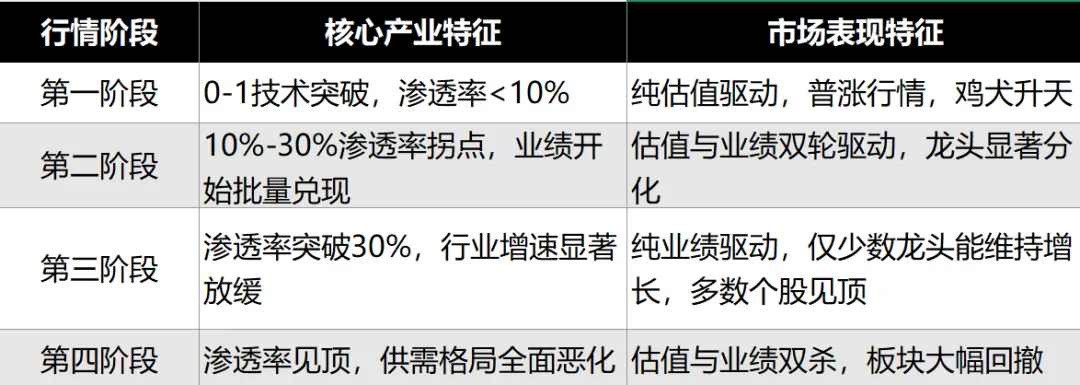 回望A股30余年历史,真正能称得上“时代浪潮级别的产业革命行情”,仅有5轮,分别是1999-2000年初代互联网科网浪潮、2013-2015年移动互联网+浪潮、2018-2019年5G浪潮、2019-2022年新能源革命浪潮、2019-2021年半导体国产替代浪潮。每一轮行情都遵循着“技术突破→渗透率拐点→业绩兑现→估值泡沫→预期反转→泡沫出清”的完整周期,其核心规律对当下AI算力行情有着极强的参考意义。
