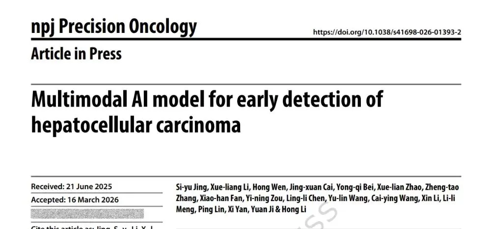 新鲜出炉!今天给大家深度剖析一篇2026年3月发表在《Npj Precision Oncology》上的文章,题目为:用于肝细胞癌早期检测的多模态AI模型。