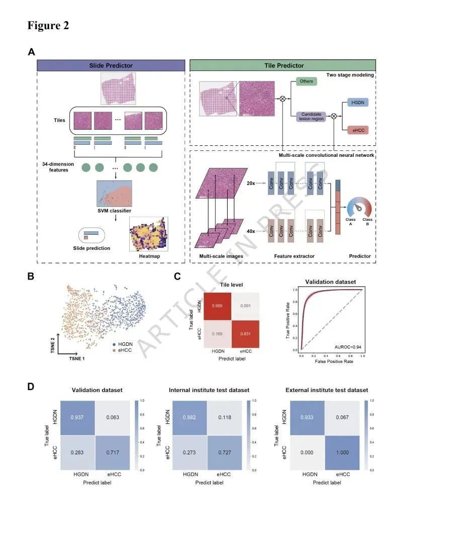 提出两阶段多尺度深度学习模型(TMC-net),能够从H&E图像中捕捉eHCC与HGDN之间的细微特征差异。