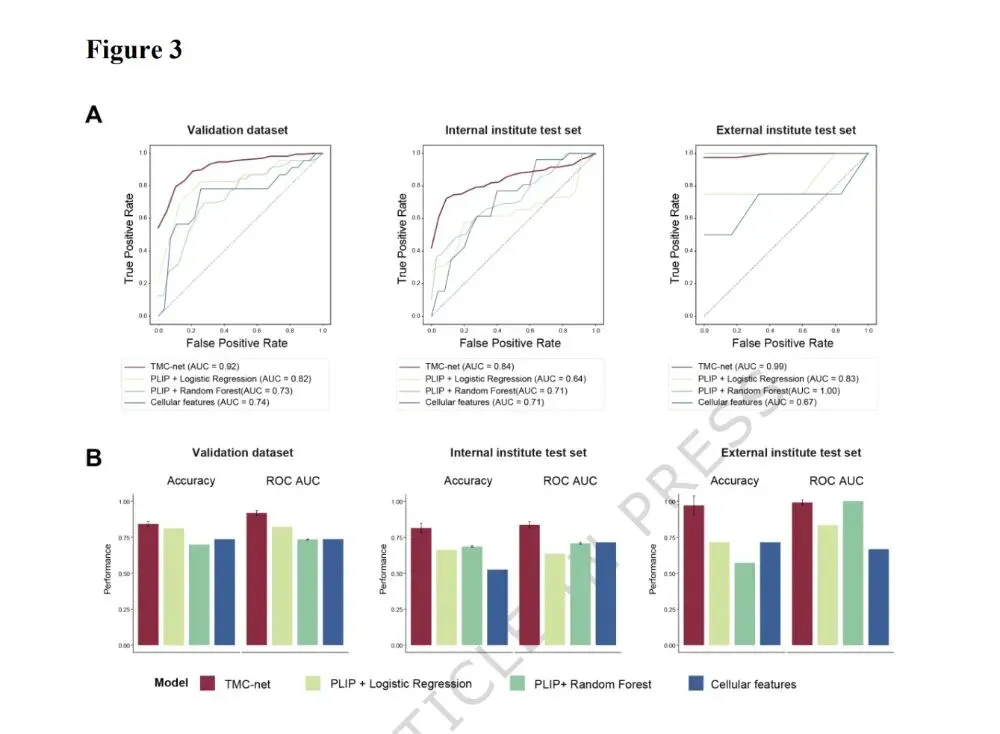 TMC-net模型在H&E图像特征提取上优于病理学基础模型和传统组织病理学特征,且学习到的特征与临床诊断标准一致,可辅助低年资病理医生提高诊断准确性。