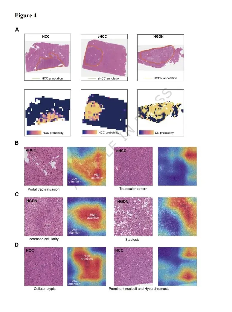 全切片诊断框架不仅提供H&E切片上的预测,还能支持人类病理学家。通过突出显示HCC高概率区域(图4A),TMC-net可以帮助病理学家关注潜在的恶性区域,并减少诊断所需的时间。我们邀请了不同经验水平的病理学家评估验证数据集,包括两名经验不足5年的初级病理学家、一名中级病理学家和一名经验超过15年的高级病理学家。每位病理学家在没有任何其他辅助的情况下独立诊断WSI。TMC-net预测的图块HCC概率随后被可视化为风险热图,突出显示了更可能代表恶性病变的区域。几个月后,初级病理学家在TMC-net生成的风险热图的帮助下重新评估了WSI。诊断结果显示,在风险热图的帮助下,初级病理学家之间的评估者间一致性kappa分数提高了9%。他们的诊断准确率从无辅助时的0.60提高到热图辅助时的0.77,F1分数从0.61提高到0.80(补充图S3)。为了进一步阐明TMC-net的可解释性,我们与经验丰富的病理学家合作,分析了模型在图块上突出的关键组织病理学特征(见方法)。这种可解释性分析显示,通过Grad-CAM解析的TMC-net高关注区域通常与病理学家认可的、临床实践中广泛使用的诊断标准一致。例如,尽管eHCC的恶性表现不太明显,但模型准确地关注了显示门静脉侵犯的区域,这是临床HCC诊断的关键标准(图4B)。对于HGDN,TMC-net将注意力引向细胞增多和脂肪变性的区域(图4C),前者是重要特征,后者指示HGDN高风险。此外,我们还将分析扩展到几张WD-HCC切片,TMC-net在这些切片上突显了显示明显细胞异型性、显著核仁和深染的区域,这些都是恶性转化的标志(图4D)。总之,TMC-net预测所突出的关键组织病理学特征反映了经验丰富的病理学家所认可的诊断标准。这种人工智能辅助方法代表了一种有价值的决策支持系统,可在临床环境中提高HCC的早期检出率。