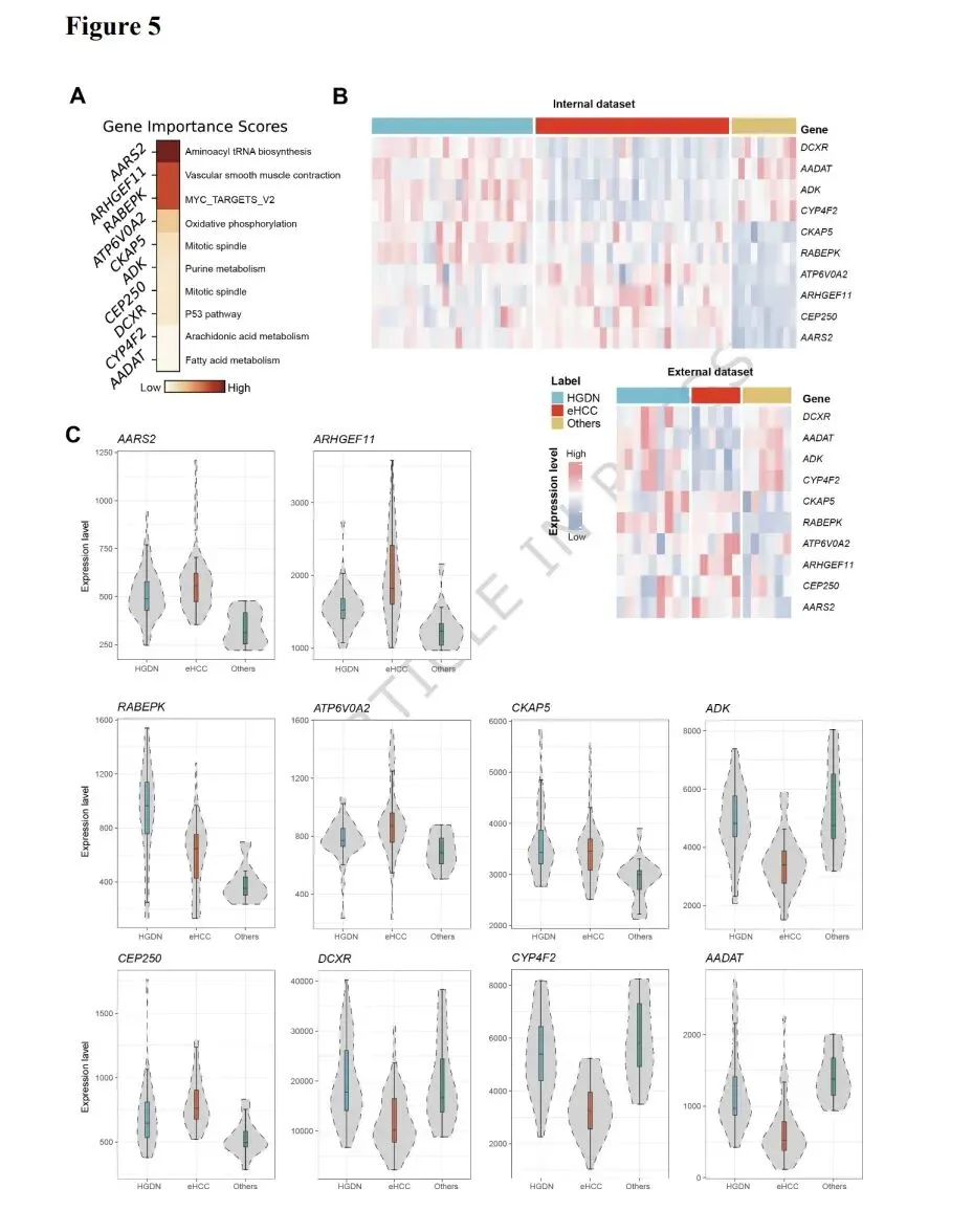 接下来,我们试图进一步阐明区分eHCC和HGDN的分子基础,并识别潜在的生物标志物。我们测量了来自eHCC、HGDN和周围肝脏对照组织的显微切割组织的转录组。通过比较HGDN和eHCC样本之间的DEG,我们观察到了与从癌前状态向早期恶性状态进展一致的不同分子特征。在HGDN中,上调的基因显著富集在与外源物代谢、氨基酸和有机酸加工、氧化磷酸化和脂肪生成相关的代谢通路中(补充图S4A和S4B)。相比之下,eHCC样本表现出与上皮-间充质转化、细胞粘附、有丝分裂和细胞周期调控相关基因的显著上调(补充图S4C和S4D)。这些转录特征与eHCC更具侵袭性、增殖性的表型特征一致。接下来,采用特征重要性分析算法来筛选能够在不同病变之间实现良好分类的潜在生物标志物基因。排名前10的基因是AARS2、ARHGEF11、RABEPK、ATP6V0A2、CKAP5、ADK、CEP250、DCXR、CYP4F2和AADAT(图5A)。值得注意的是,这些关键基因不仅在内部队列中表现出显著的表达差异,在独立的外部数据集中也是如此(图5B;补充表S3)。其中,ARHGEF11、RABEPK、ATP6V0A2、ADK、CEP250、DCXR、CYP4F2和AADAT在HGDN和eHCC样本中显示出显著不同的表达模式(图5C),这与先前观察到的与血管平滑肌收缩和各种代谢过程相关的通路富集一致(补充图S4A、S4B、S4C和S4D)。