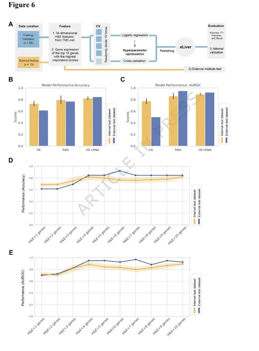 为了探索组织病理学和RNA表达的结合是否能更全面地表征eHCC特征并提高诊断性能,我们首先整合了34个基于TMC-net的组织病理学特征和10个关键基因的表达,构建了一个多模态模型。考虑到输入特征是通过单变量分析识别的潜在生物标志物,具有明确的生物学意义。此外,由于样本的珍贵性,双模态队列的规模有限。因此,我们选择了一个相对简单的逻辑回归模型作为分类器,以降低过拟合风险并促进结果的可解释性。内部队列被随机分为80%的训练集和20%的内部测试集,此过程重复10次以评估模型的稳健性(图6A;见方法)。结果显示,多模态eLiver模型在区分eHCC和HGDN方面优于任何单一模态方法,准确率达到0.8231±0.0308(图6B)。相比之下,仅使用RNA特征的准确率为0.7962±0.0731,仅使用H&E特征的准确率为0.7308±0.0455(图6B)。多模态模型显示出比单模态模型更好的泛化能力和抗噪性。eLiver在外部测试集上的性能没有下降,准确率达到0.8462(图6B)。此外,eLiver模型的AUROC在内部测试集上为0.8938±0.0230,在外部测试集上为0.9250,两者均高于单模态模型的分类性能(图6C)。为了探索准确诊断所需的最少分子特征数量,我们在相同的建模框架内执行了特征选择过程(图6A;见方法)。我们按照基因重要性评分的顺序,将RNA表达水平添加到TMC-net衍生的H&E特征中,并构建了具有不同数量特征的多模态模型。结果表明,随着基因数量的增加,模型在内部和外部测试集上的准确率和AUROC均有所提高,表明分子数据可以有效补充基于H&E的病变诊断(图6D和6E)。值得注意的是,通过添加H&E特征和前4个关键基因,AUROC在内部测试集上从0.7308±0.0455增加到0.8875±0.0459,在外部测试集上从0.6154增加到0.9500(图6E)。然而,随着基因数量的进一步增加,模型在测试集上的准确率和AUROC并未显示出明显改善(图6E)。然后,我们探索了四种常见生物标志物蛋白的表达。结果表明,与我们潜在的生物标志物相比,相应的基因分类性能有限,特别是在外部测试集上(补充图S5A和S5B)。与基于IHC标志物的诊断结果相比,我们的多模态方法可作为增强早期肝癌检测的补充或替代工具(补充图S5C)。这表明,结合H&E图像和前4个关键基因的RNA表达,可能代表了在诊断性能和实际临床可行性之间的最佳权衡,特别是在不易获得专业病理学专业知识的情况下。