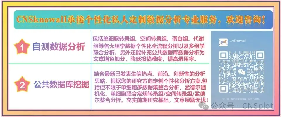 福利大放送!!!关注回复“资料”2字,即可免费领取生信资料,包括数据集、绘图代码、图表复现、思路总结、参考文献……0代码鼠标点一点,就能轻松完成5—10分生信SCI全文复现!(持续关注我们,每天为您解读最新见刊的文献!)