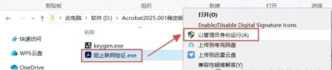2.选中【阻止联网验证】鼠标右键选择【以管理员身份运行】。(如果打开此文件夹是空的,一般是文件被杀毒软件或者系统防护、实时保护等拦截删除了,退出防护重新解压即可)