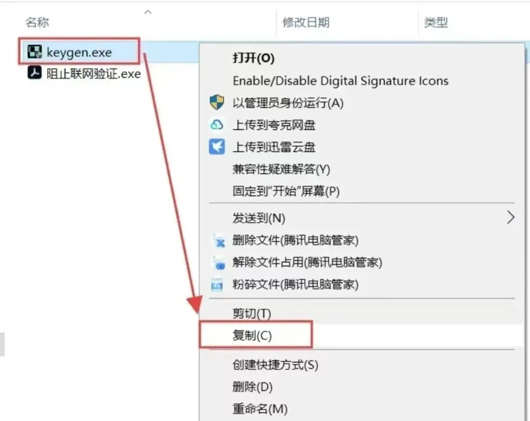 5.选中【keygen】程序,鼠标右键选择【复制】。(或者选中直接Ctrl+C键复制)