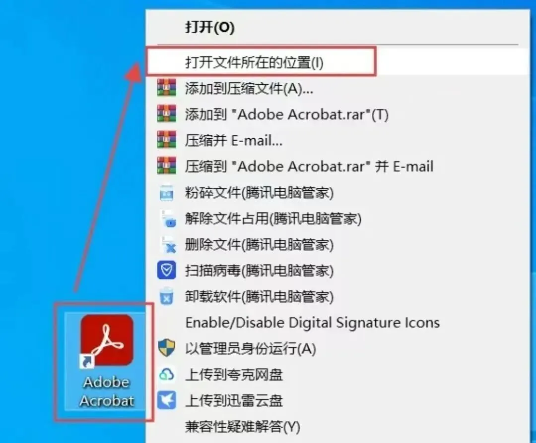 6.回到电脑桌面,选中刚安装的Adobe Acrobat快捷方式,鼠标右键选择【打开文件所在的位置】。