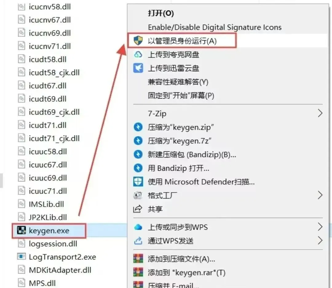 9..选中粘贴过来的【keygen】程序,鼠标右键选择【以管理员身份运行】。
