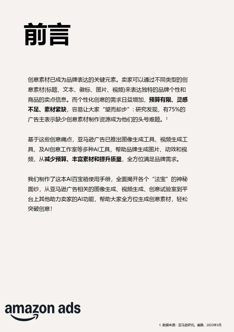 本文件深度剖析了亚马逊广告生成式AI工具的应用实践,为出海企业提供了从0到1的低成本、高效率创意素材生产方案。文件指出,随着广告竞争加剧与消费者对视觉内容要求提升,跨境卖家必须借助AI技术突破“预算有限、灵感枯竭、素材短缺”的三大创意瓶颈,实现广告ROI的显著增长。