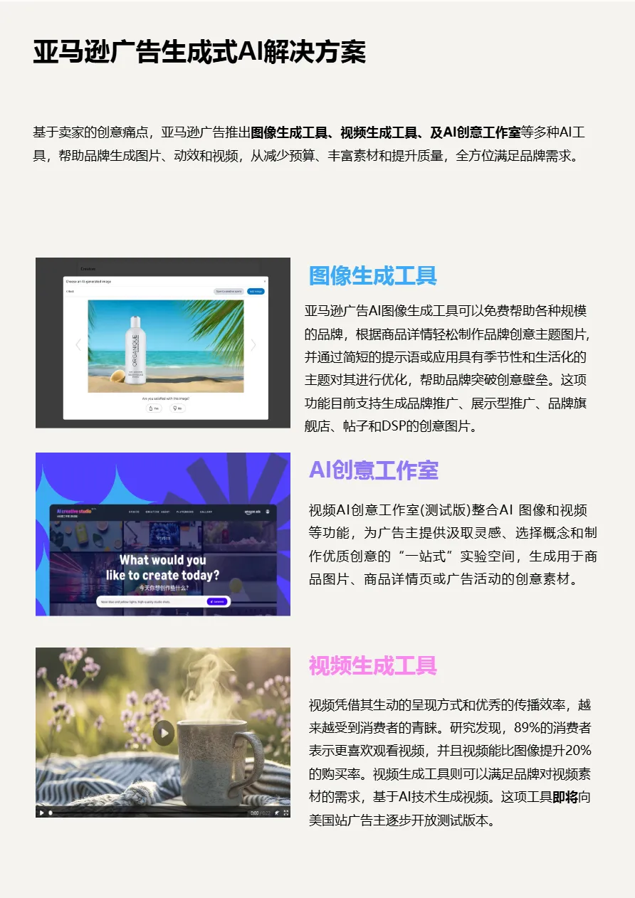 • 三大核心AI工具矩阵已成型:亚马逊广告推出AI图像生成工具、AI创意工作室(测试版)、视频生成工具(测试版),覆盖图片、动效、视频全类型素材生产,支持品牌推广、展示型推广、品牌旗舰店、帖子及DSP等多场景投放。