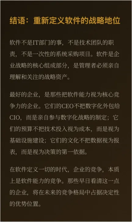 更深一层:拥有良好软件基础设施的企业,不仅能快速响应外部变化,还能在内部快速试错与迭代。当一种商业模式不奏效时,调整成本低;当发现新机会时,部署速度快。软件让企业从“大象“变成了“猎豹“。