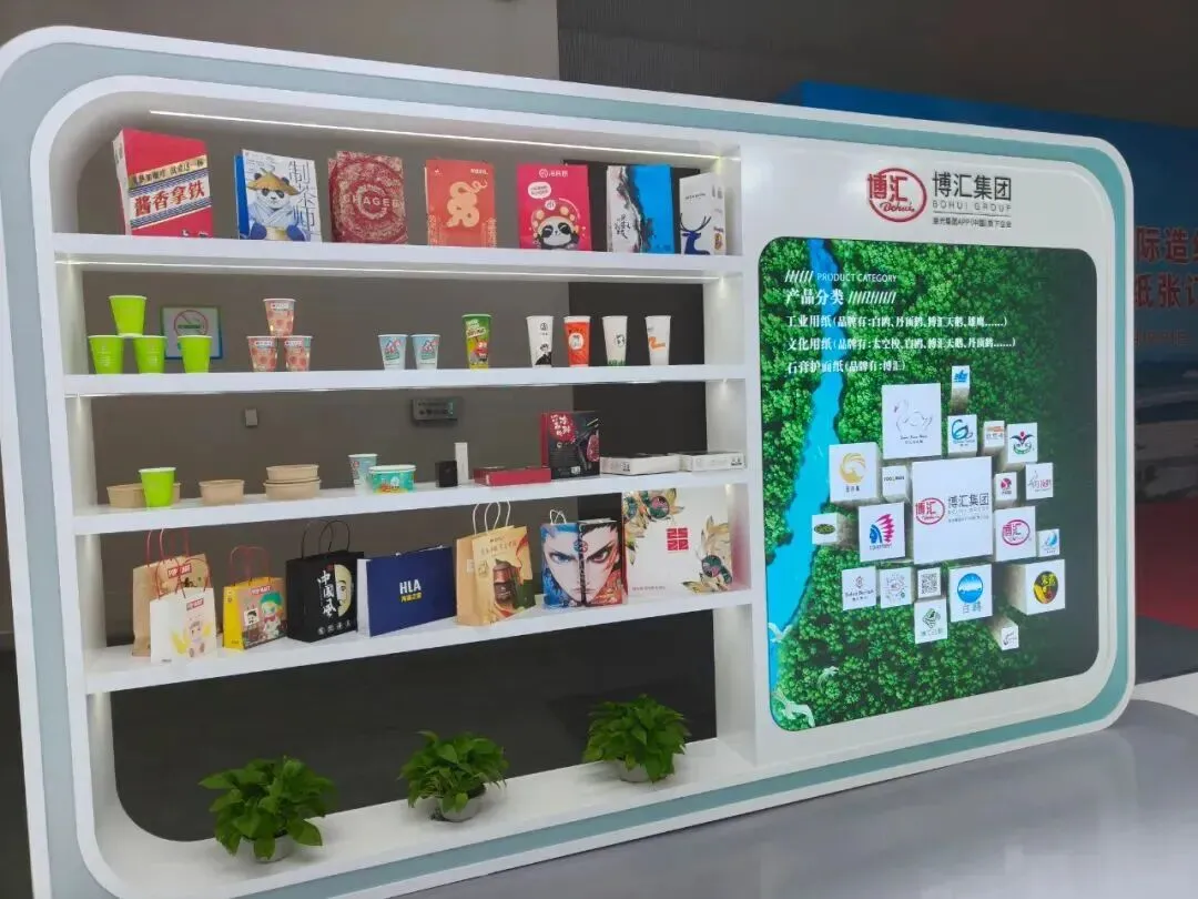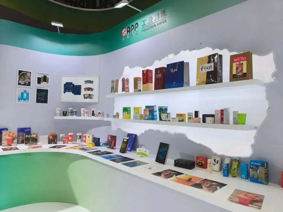 APP(中国)展台陈列全系列工文纸产品,涵盖白卡、铜版卡、食品卡、铜版纸、双胶纸、牛皮纸及特种纸等,每款产品均获得专业观众高度关注。