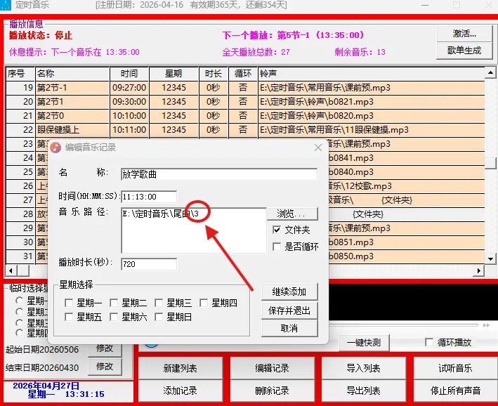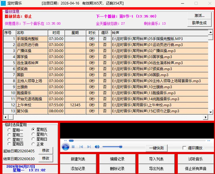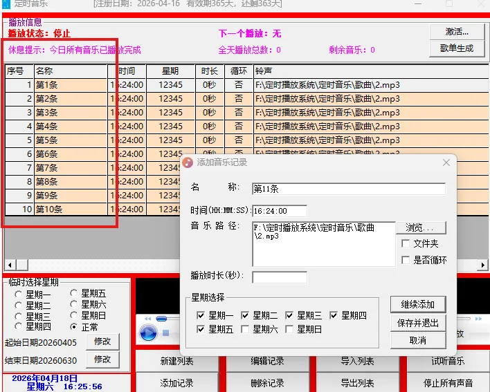 2、可以临时选择星期的某一天播放,供放假调整时间临时用;