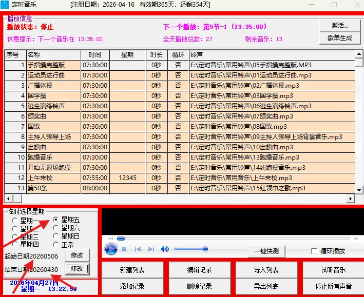 3、还可设置播放日期的有效期,如五一节放假5月1日至5月5日,可以把起始日期设为5月6日,结束日期设为4月30日,这样可以让放假的五天停播,但前后日期正常播放。