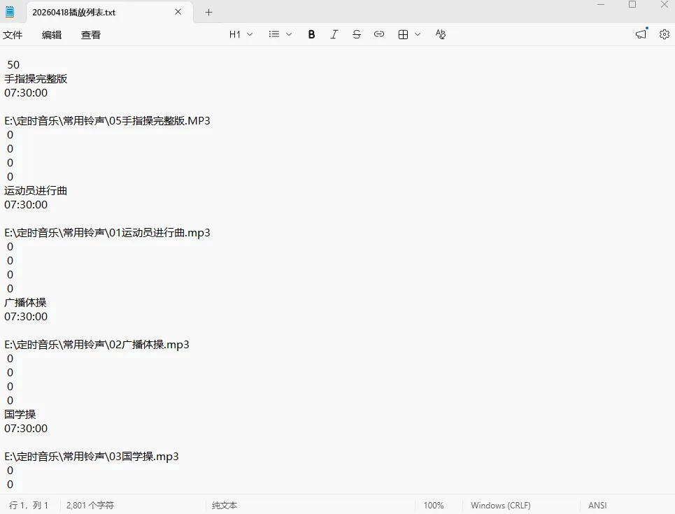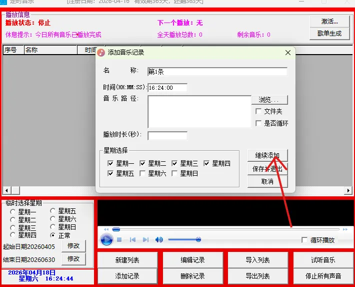 4、添加记录列表非常简单,只需修改时间,先预选歌曲,然后不断点继续添加,就能不断生成列表,然后采用后面介绍的方法修改相应的歌曲,非常简单高效,当然也可以一个个的添加。效果如下: