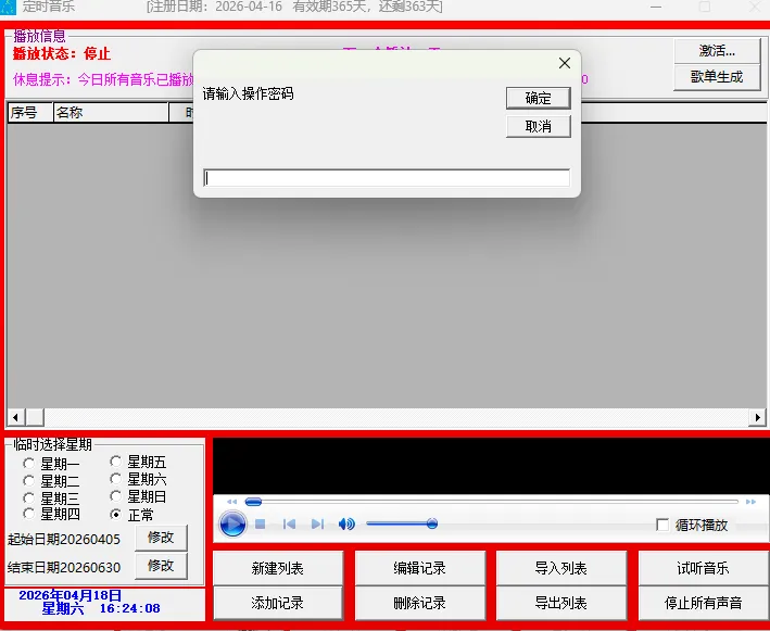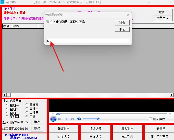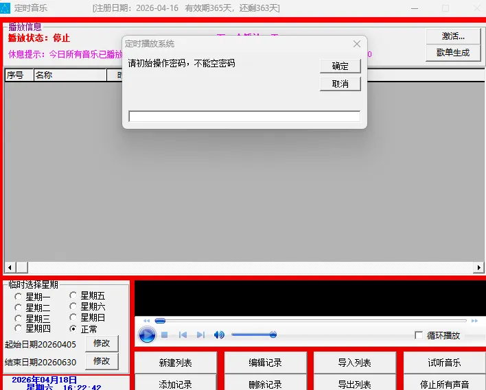 7、初次启动时,会提醒初始操作密码,目的是以防他人随便乱点篡改了数据,以后每次在界面的改动都需要输入密码,密码就保存在根目录的schedule.dat的第二行,可以从上面的导出列表和记事本打开的schedule.dat中看出第二行的不同。