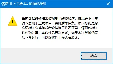 Map2Shp软件安装完成之后,就获得了免费试用版软件,你可以使用其中的全部功能,仅仅限定了文件的转换精度,转换结果仅用于评估转换效果,不可用于实际工程项目。试用版转换后将提示“请使用正式版以消除限制!”