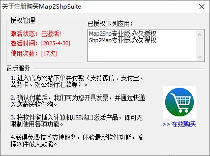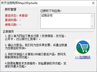 购买成功,获得软件狗后,您就成为了正式用户,不仅可以无限制地使用各项功能,还可享受免费升级服务。先将加密狗插入电脑USB插口,重新启动Map2Shp软件即可,正式版转换时,严格保持原始数据一致,无任何精度损失。