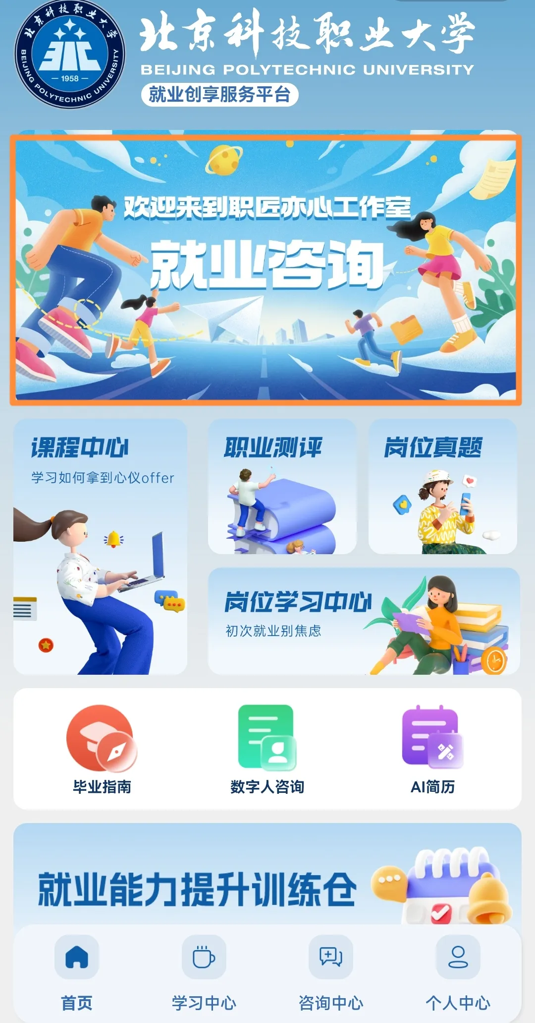 (1)搜索微信小程序“北职大就业创享服务平台”或扫描二维码