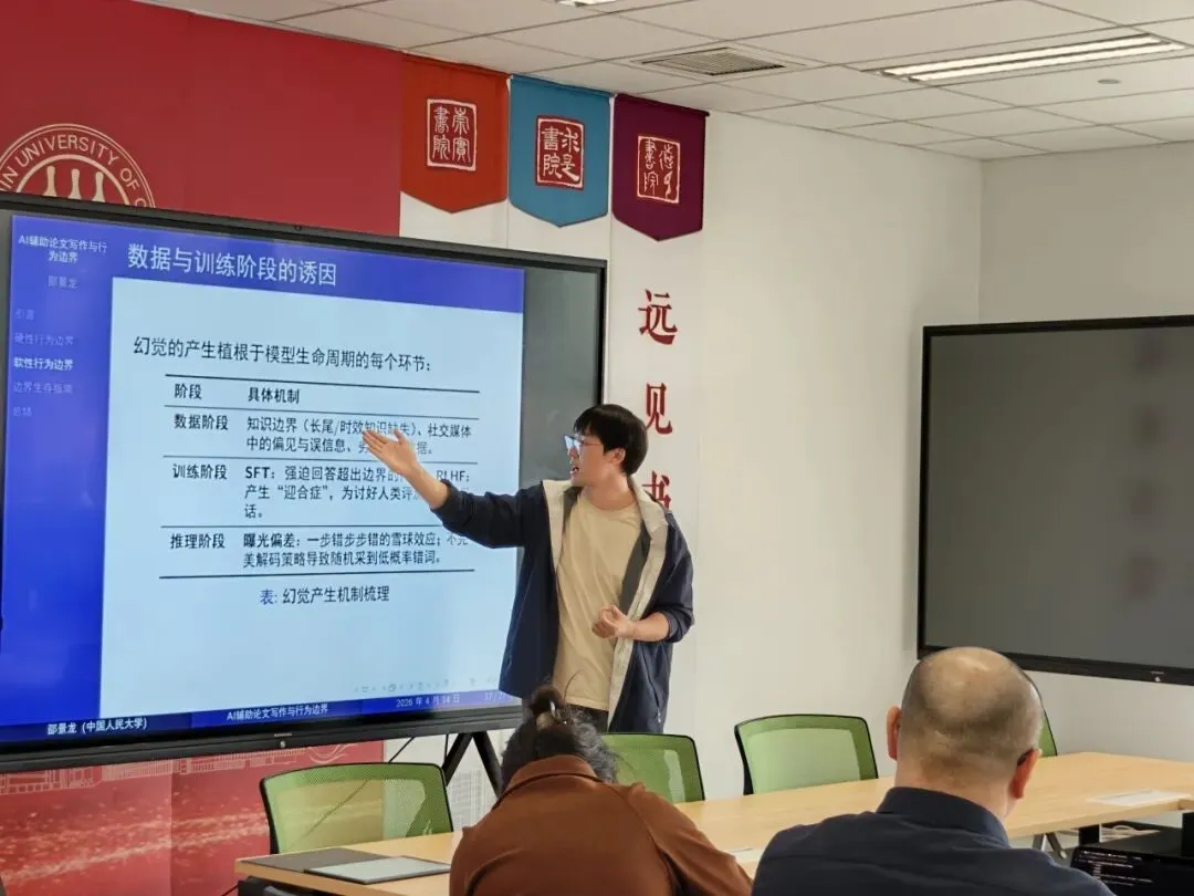 邵景龙进一步提出将AI幻觉细分为事实性幻觉与忠实性幻觉,并从数据训练、监督微调、推理生成等多个环节剖析了幻觉产生的根源。他强调,AI的“过自信”机制、逆向诅咒以及模型本身的数学限制,都可能导致其在特定情境下输出错误或编造的信息,研究者必须对AI的产出保持审慎的批判态度。