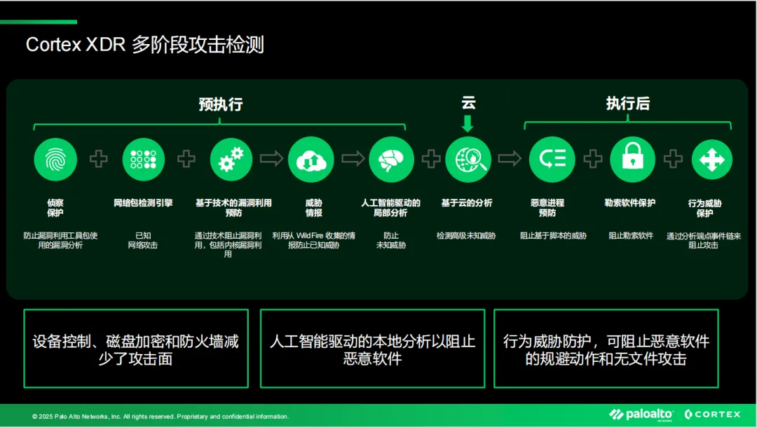 Cortex XDR专为终结这一困境而生。作为全球领先的端点安全解决方案,它通过构建统一的数据底座,打破了传统产品间的壁垒。其核心防御机制涵盖了攻击的全生命周期: