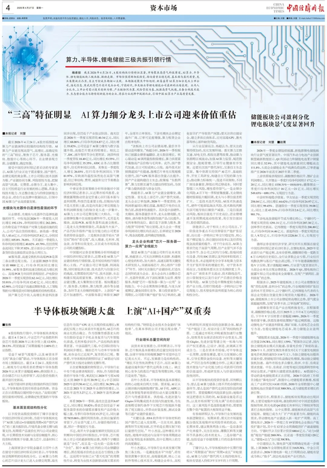 截至2026年4月24日,A股结构性行情特征显著,市场聚焦高景气科技赛道,AI算力、半导体、锂电储能板块三极共振、联袂走强。市场估值逻辑彻底转变,转向看重业绩兑现、基本面与盈利质量,龙头集聚效应凸显,自主可控成长期核心主线。本期报道聚焦中际旭创、新易盛等AI算力细分龙头上市公司,海光信息、寒武纪等芯片设计龙头公司,宁德时代、华友钴业等锂电储能公司最新的业绩表现。业内人士认为,上市公司需以技术创新为根、产业链协同为翼、风险管控为基,把握高景气机遇,具备全栈技术能力、生态整合能力与持续创新能力的企业,将在行业洗牌中脱颖而出,引领中国AI算力产业高质量发展。