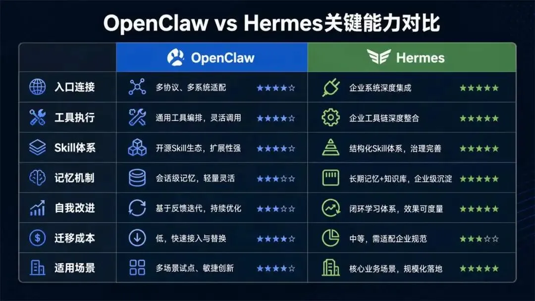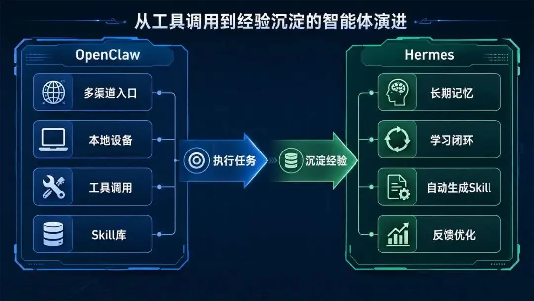 关键能力对比:OpenClaw解决连接,Hermes强化进化
