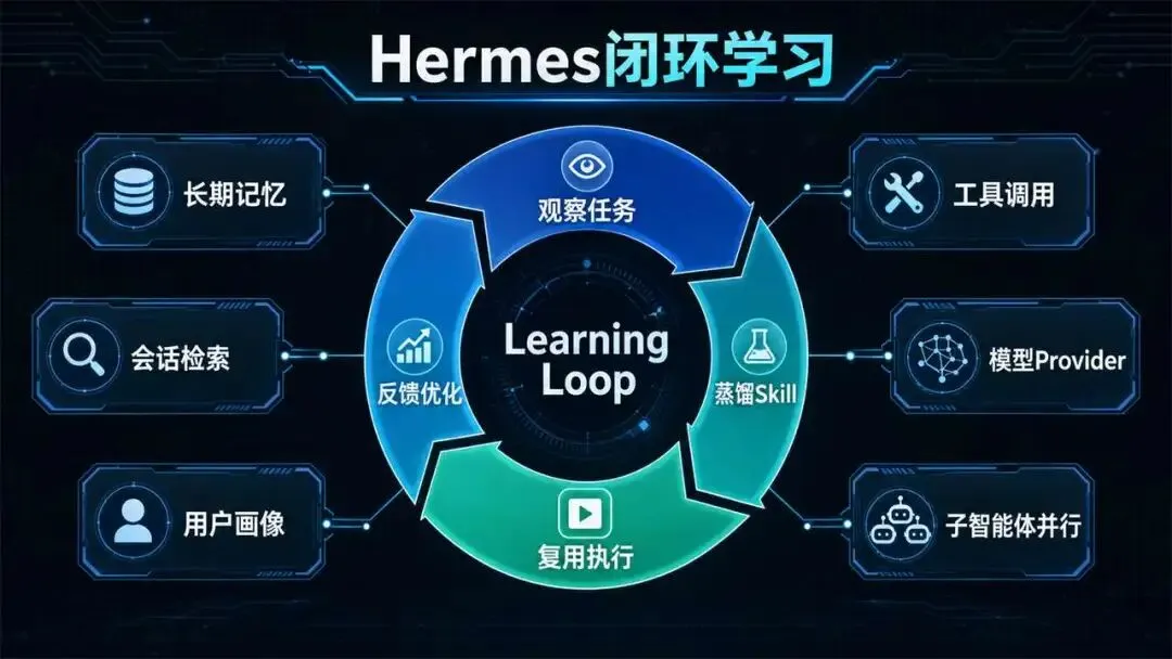 Hermes最值得关注的不是它也能聊天、接入消息平台、运行在本地或云端,而是它把“自我改进”设计成框架级能力。按照官方文档,Hermes内置学习闭环,能够从多步任务中观察过程,在相似任务多次成功后生成Skill,并在后续使用中继续修正。