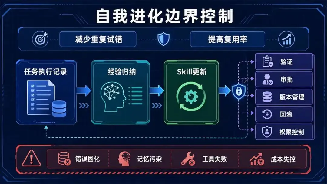自我进化还必须有边界控制。系统如果能自动修改Skill,就必须具备版本记录、回滚机制、权限审批和质量校验。否则它可能把偶然成功固化成错误规则,也可能长期积累混乱记忆。可用的学习闭环必须有证据地归纳、有约束地更新。