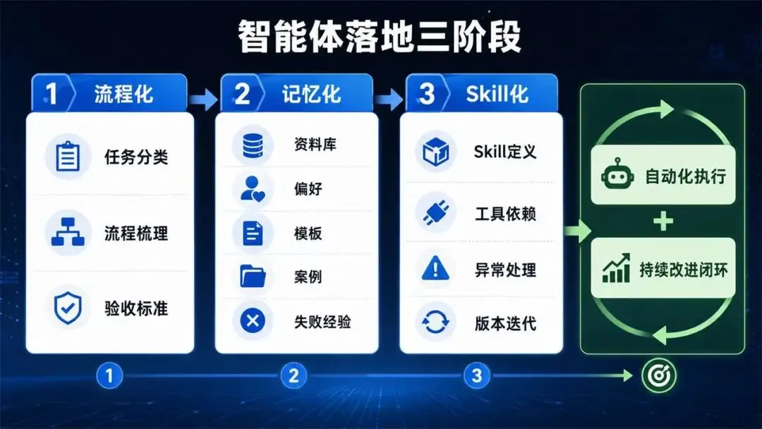 最后才是自动化和进化。系统每完成一次任务,都要把过程日志、用户修改、最终结果和失败原因沉淀下来。多次成功后归纳为Skill,多次失败后形成避坑规则。Hermes式闭环学习不是替代思考,而是帮助人把思考结果产品化。