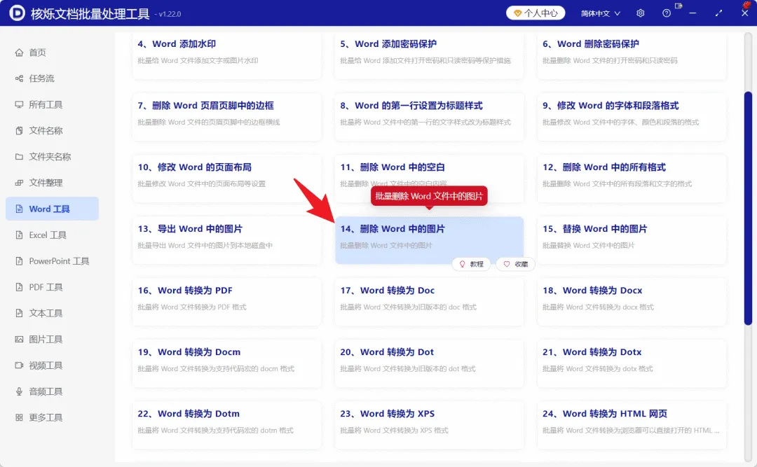 打开核烁文档批量处理工具后,在左侧找到“Word 工具”分类。在功能列表中选择“14、删除 Word 中的图片”。