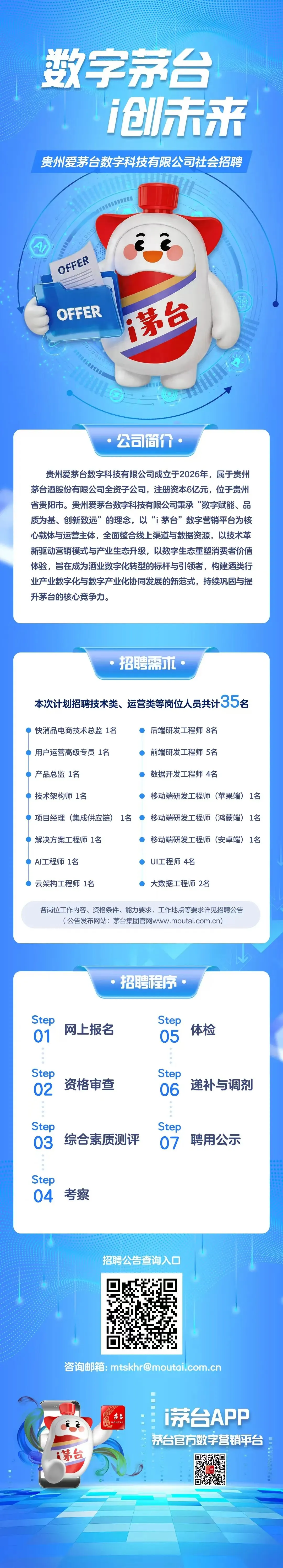 基于强劲的发展态势,茅台数科推出成立后的首批社会招聘,设置16个岗位、计划招录35人,覆盖技术研发、平台运营、AI运营、大数据等方向。