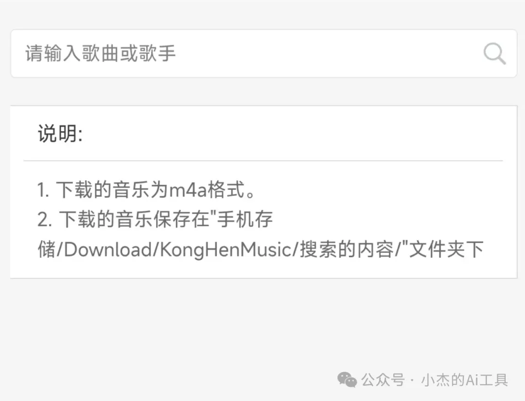 极简界面:打开软件,用户即可看到一个简洁的搜索框,直接输入歌曲名或歌手名即可开始搜索。 -