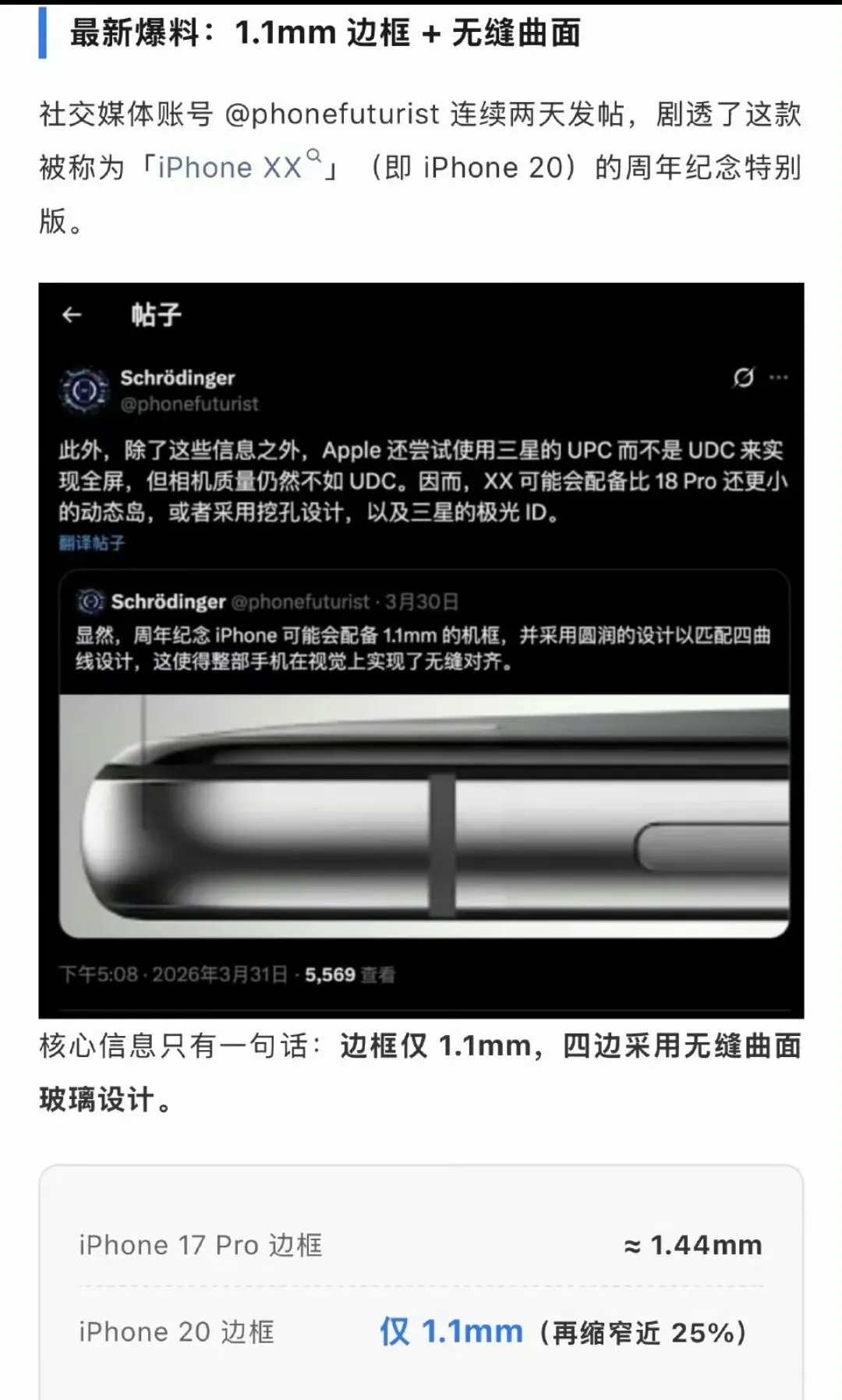 根据供应链爆料,苹果这款iPhone20,并非照搬安卓早年的大曲率曲面屏,而是经过多年打磨的**Pol‑less定制四微曲屏”,曲率克制且均衡,搭配1.1毫米极窄边框,实现屏幕与中框的自然过渡,既拥有曲面屏的一体观感和温润手感,又能最大程度规避误触、碎屏等痛点。