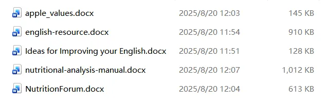 在处理前,你的电脑中通常会先准备好一批 Word 文件。示例中可以看到,待处理的是多个 .docx 文档,例如 apple_values.docx、english-resource.docx、NutritionForum.docx 等。