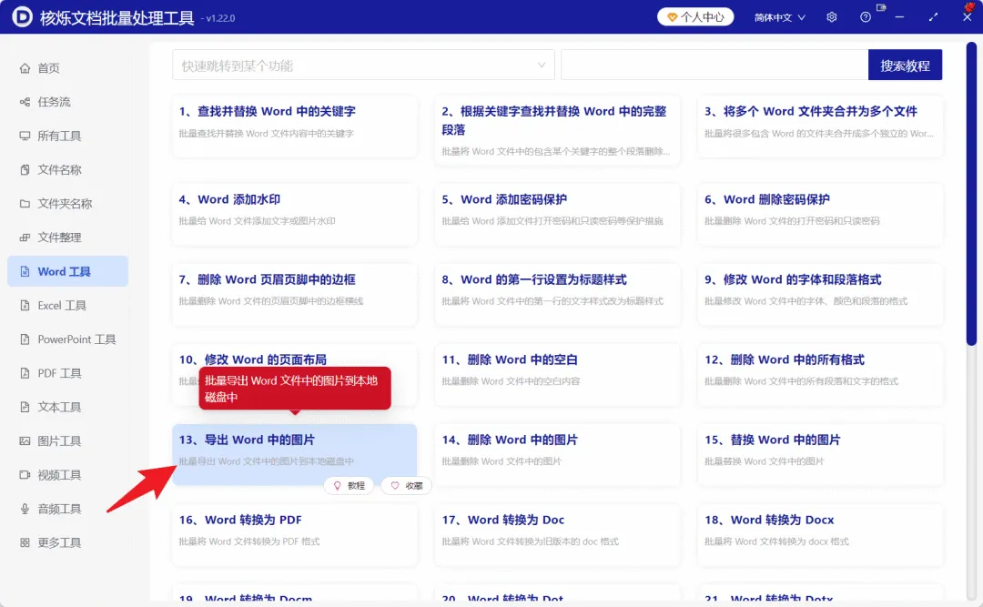 第 1 步:进入 Word 工具并找到“导出 Word 中的图片”