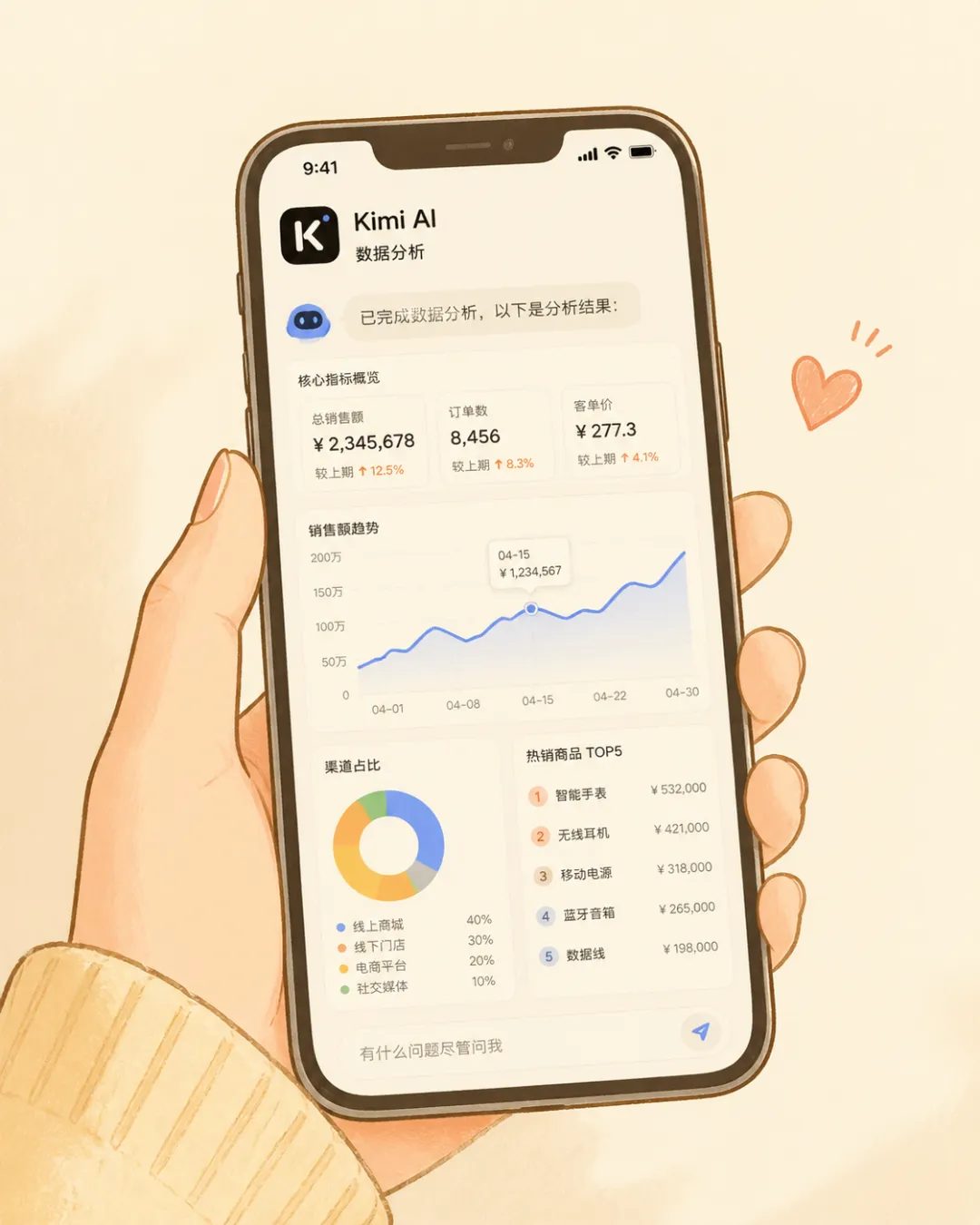第一件: 打开Kimi(kimi.moonshot.cn),把你最近一个月的销售数据传上去,让它帮你分析。什么都行,Excel表格、手写单据拍照、甚至你口述的数据都可以。