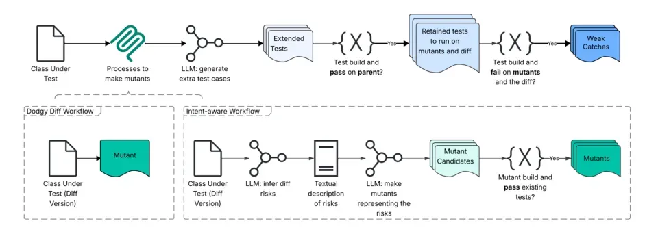 一个关键组件是 Dodgy Diff 与意图感知工作流架构,它将代码变更重新定义为语义信号,而非文本差异。系统会分析 diff,以提取行为意图和风险区域,然后执行意图重建和变更风险建模,以理解哪些可能因此而出错。这些信号被输入到变异中,生成“可疑”的代码变体,用以模拟真实的失败场景。随后,一个基于 LLM 的测试合成层会生成与推断意图一致的测试,并通过过滤去除噪声或低价值测试,最终在拉取请求中呈现结果。