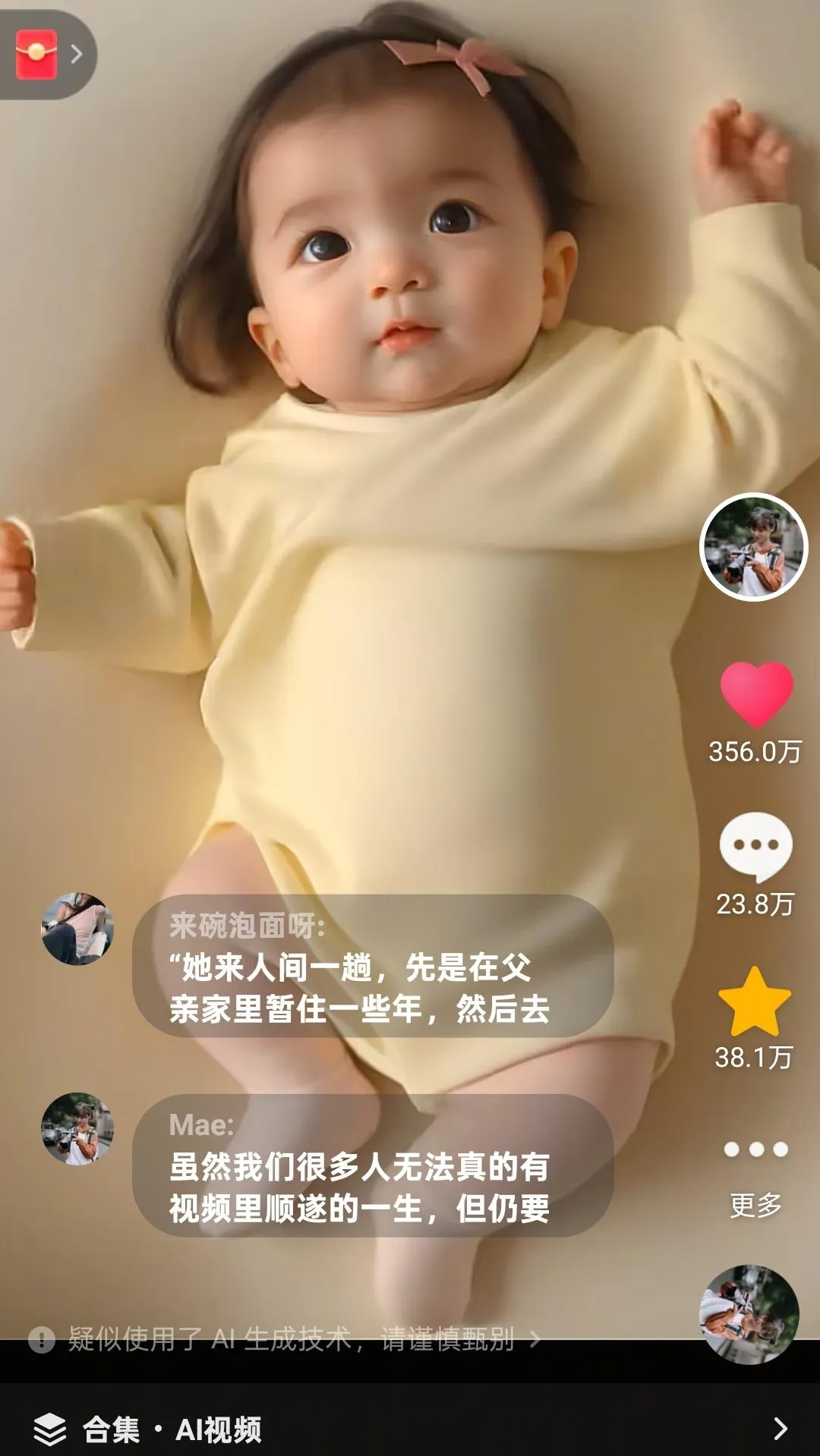 获得成功后,她又创作了《男孩的一生》,延续了相似的叙事风格,抖音点赞同样突破100万,进一步验证了AI视频在情感叙事上的广泛共鸣。