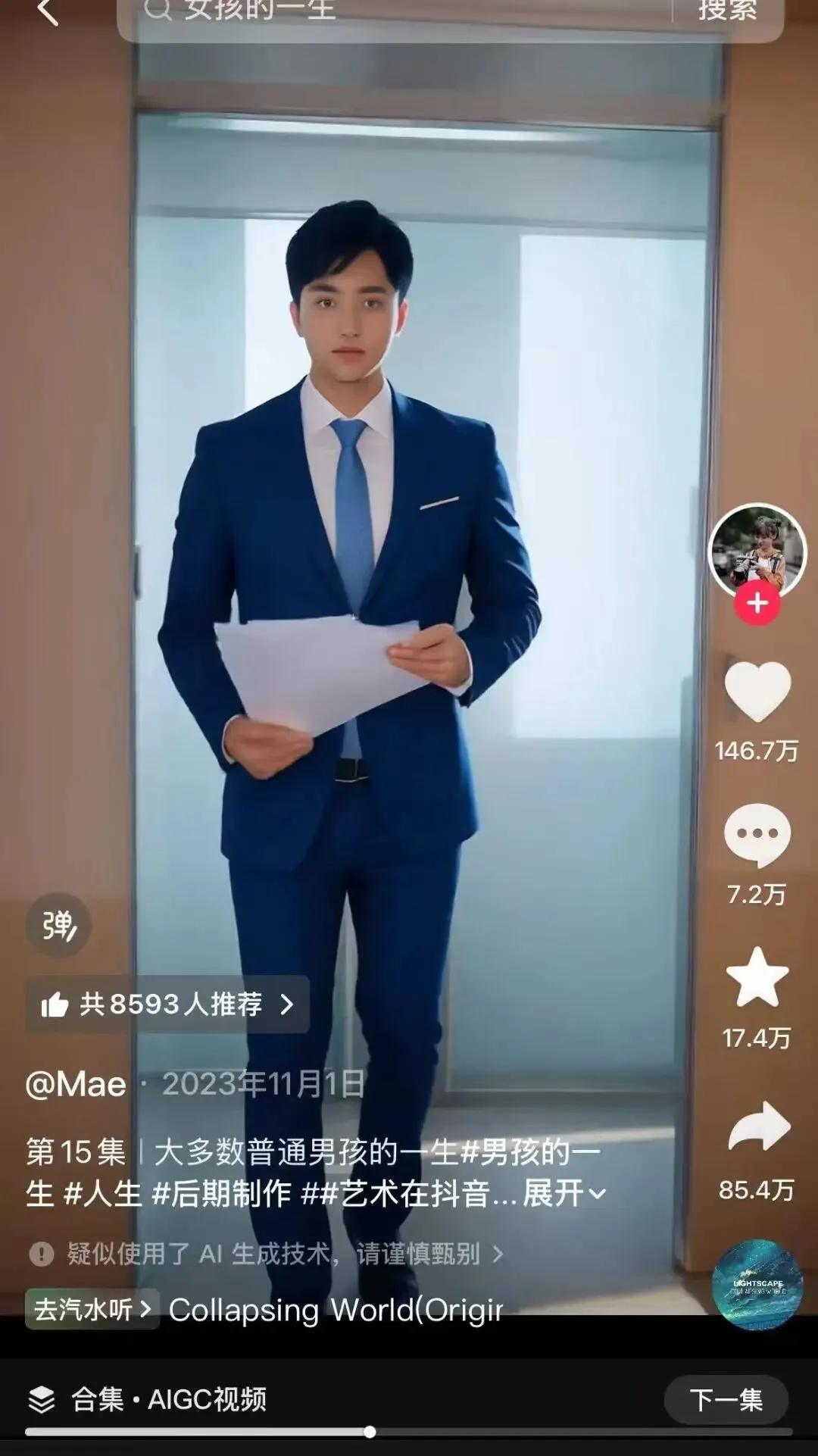 2023年10月底,她创作了《女孩的一生》。这部短片用AI生成了一名普通女性从小到大的经历:出生、上学、结婚、生子……抖音点赞量达到355万。