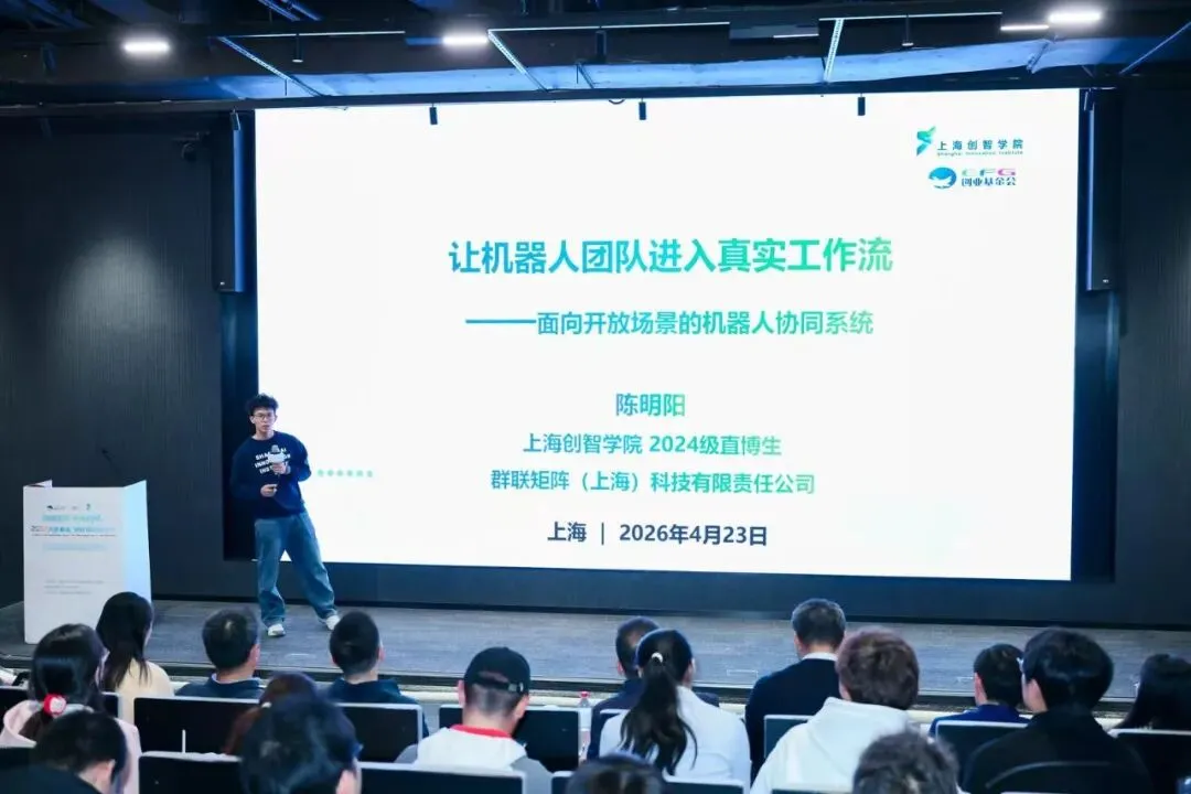 上海创智学院2024级博士生陈明阳带来了“群联矩阵”项目,他洞察到真实世界的工作流天然需要多种机器人能力的协同,而非单点突破。因此,他们的目标并非打造更强的单机,而是构建一个能让用户用自然语言直接调用、并能自动进行任务规划与分工的机器人团队协同系统。这旨在通过系统级调度,将机器人从封闭实验室带入开放的产业园区。