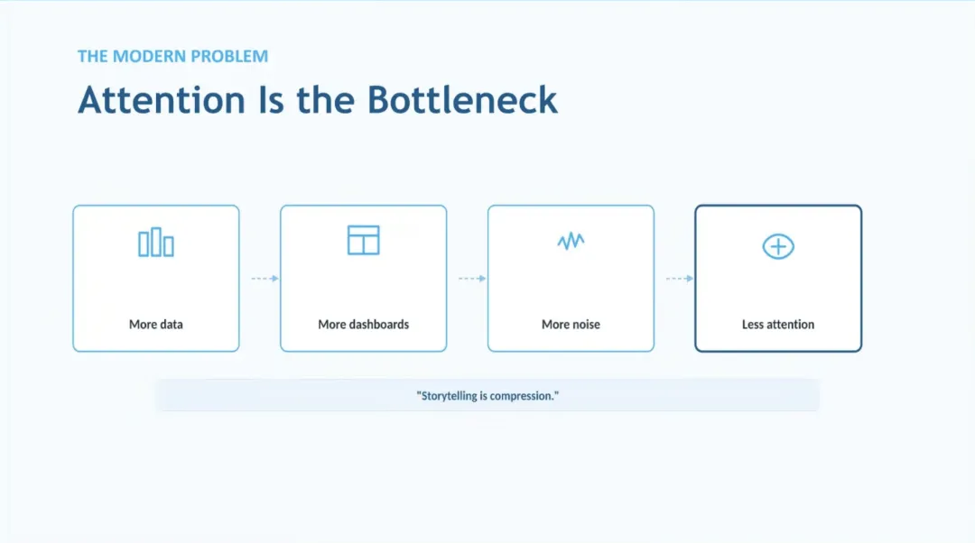 经济学家赫伯特·西蒙在 1970 年代的一句预言,在今天一语成谶:“信息的丰盛,制造了注意力的贫困。”我们每天被仪表盘、数据周报、Slack 消息和 AI 生成的摘要狂轰滥炸。数据的丰富并没有让决策变快,反而让会议的大量时间被浪费在“解释数字”上。