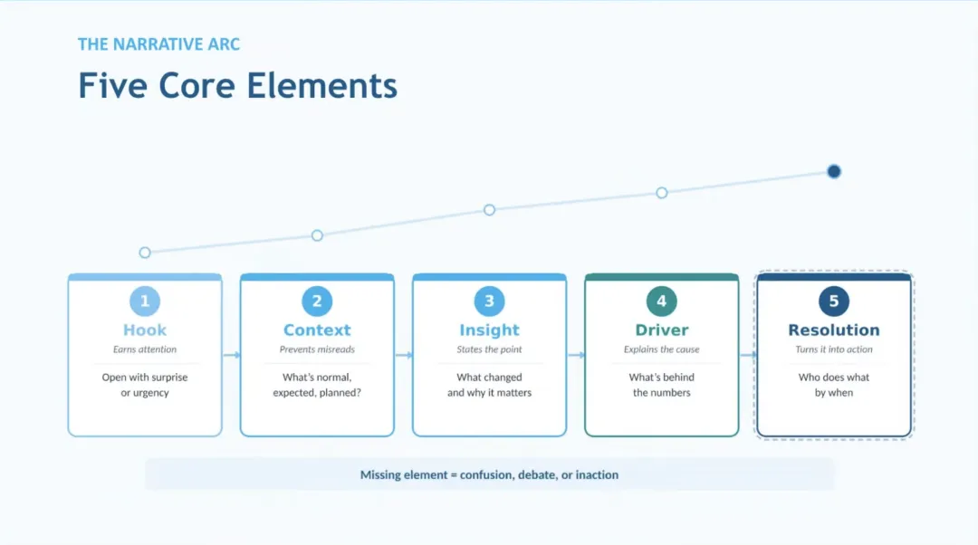 为了构建这样的叙事,Murphy 提出了五要素框架:用令人意外的“钩子”抓住注意力,设定背景基准线,揭示差距产生洞察,解释根因作为驱动因素,最后以绑定责任人的结局落地行动。