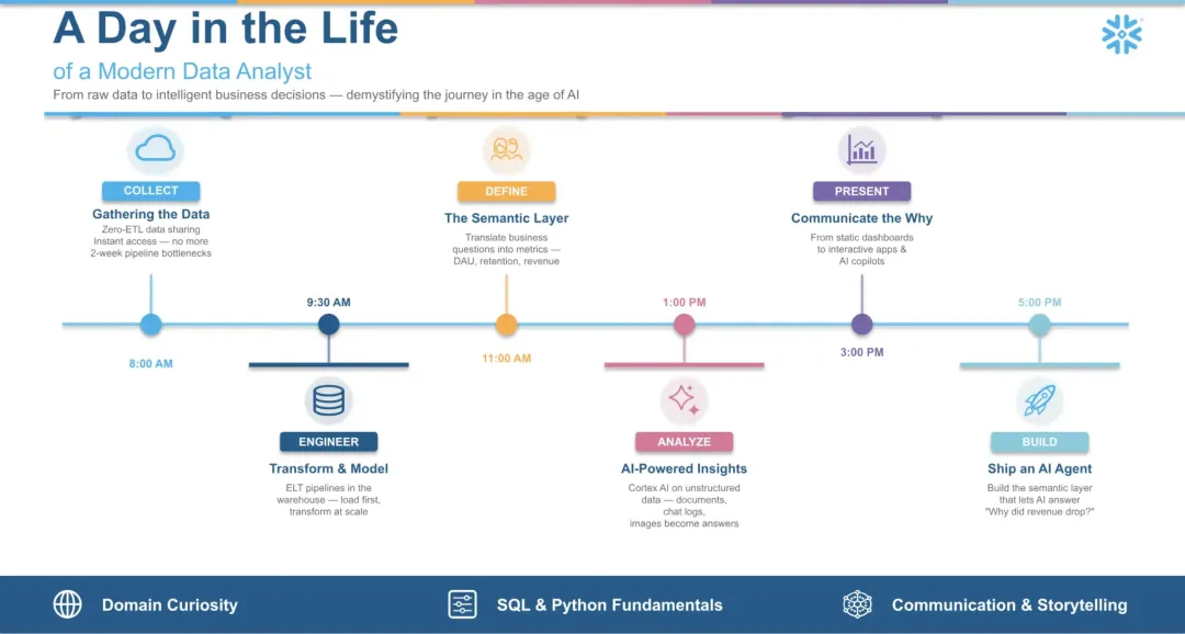 到了今天,数据工程师、分析师、AI 工程师的职业边界正在快速消融。但有一套底层能力正在跨角色凝固:SQL 查询、基础 Python、数据叙事、云平台认知,以及 AI 素养。