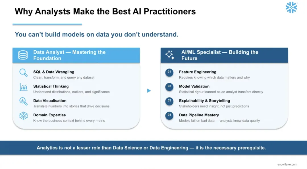 Snowflake APJ 教育销售总监 Edmondo Rosini 给出了一个中肯的建议:不要急于跳过分析师直接冲向 AI 工程师。每一位卓越的 AI 专家,骨子里都是一流的数据分析师。只有亲手处理过脏数据,你才会真正懂得偏差的藏身之处,这种直觉是无法速成的。