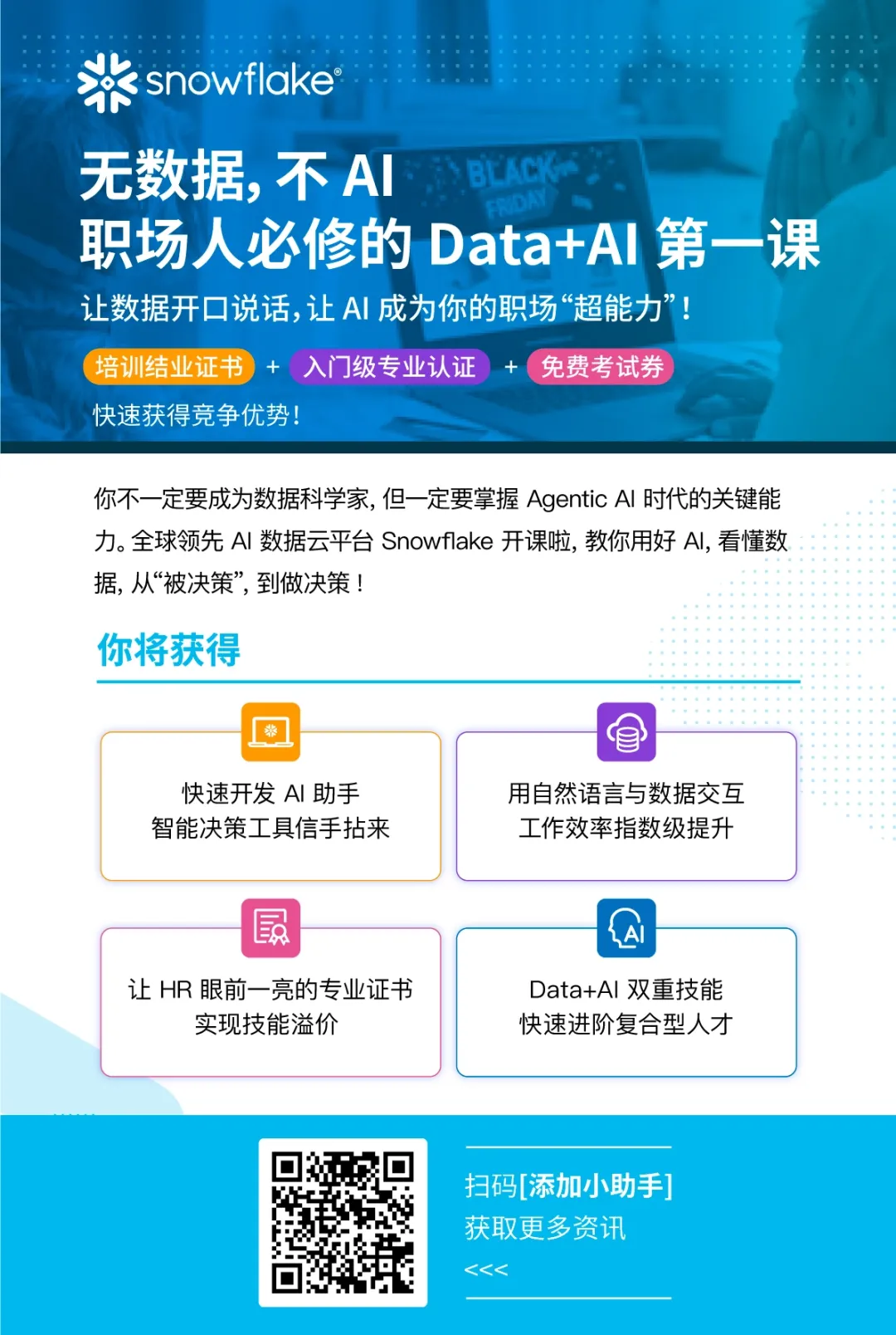 如果你也在思考如何在 AI 时代建立这种能力,,可以点击【阅读原文】关注FastTrack的官网,可以尝试从 Snowflake 的 Data + AI 平台培训开始,课程涵盖⼈⼯智能、数据云等所有相关内容,你将能够亲⾃动⼿操作,处理业务真实场景中的问题,并获得专⽤账户进⾏练习。免费福利席位有限,欢迎扫码报名~