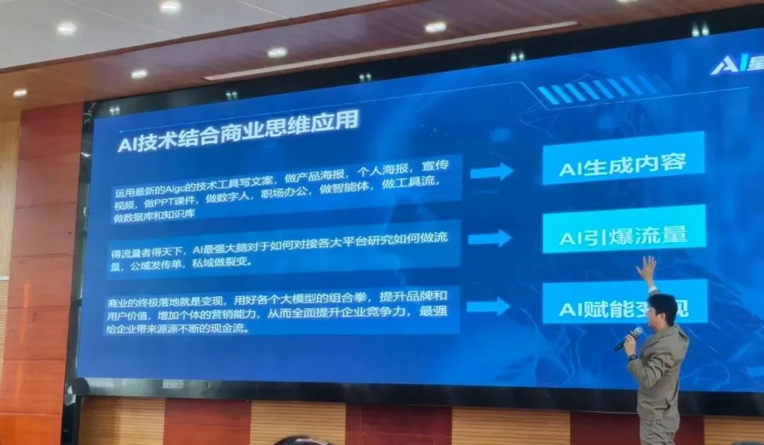 讲师从 AI 大模型的底层逻辑讲起,结合苍南本地广告行业的实际需求,拆解了 AI 在创意设计、品牌营销、客户服务中的落地路径,帮会员们破除了对 AI 技术的陌生感与畏难情绪,厘清了 “AI 不是替代人,而是放大你的生产力” 的核心认知。
